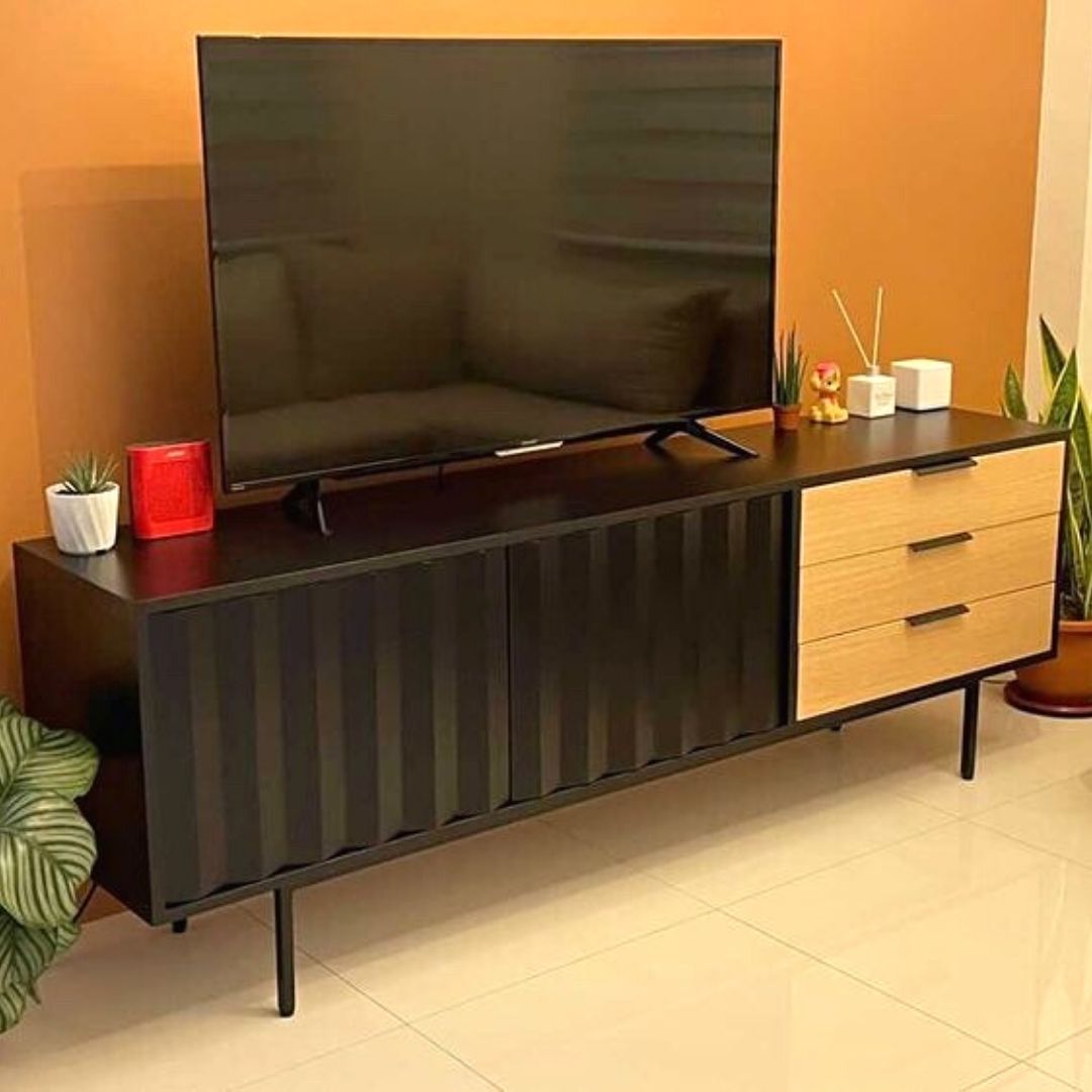 The 1.90 meter (74.8 inch) long Cheska Media / TV Console can accommodate large TVs. Matte-black finish on the main body and metal-legs, with woodgrain-finish drawer fronts as accent color.