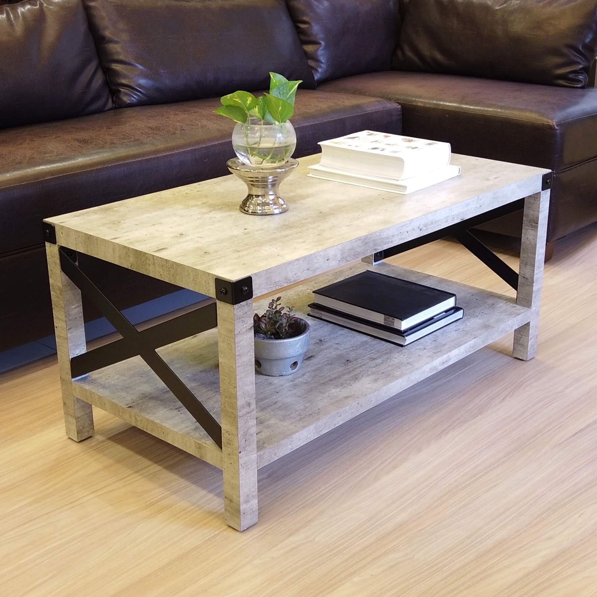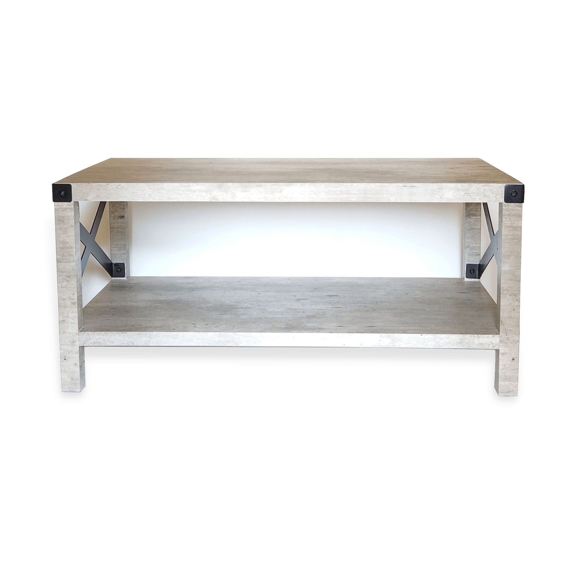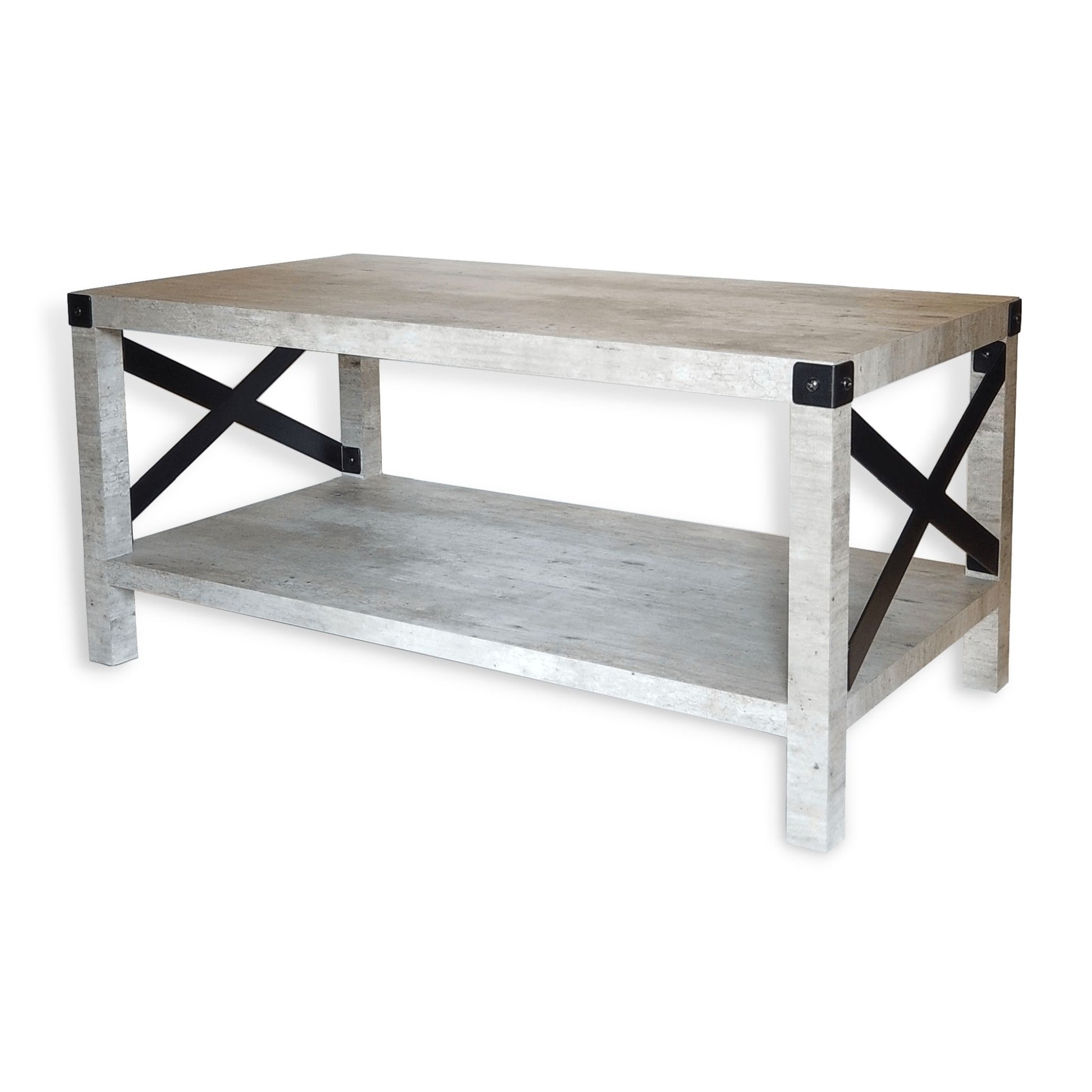 Modern urban industrial style yet a little rustic, the Erin Industrial Coffee Table features black-painted corner metal accents and x-shaped sides that complement well with the cool grey aged-cement look of the smooth surface made from durable HPLs. The shelf underneath provides extra storage for your living room knick-knacks. A center coffee table ideally suited for your living room or den.