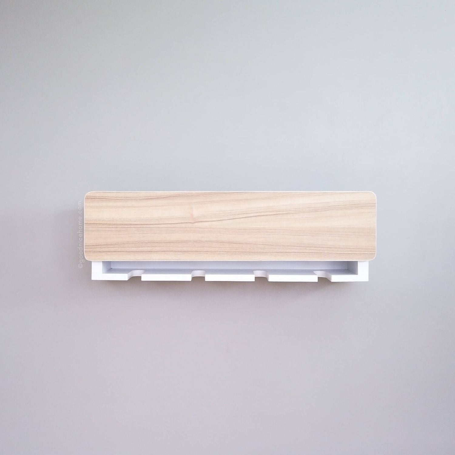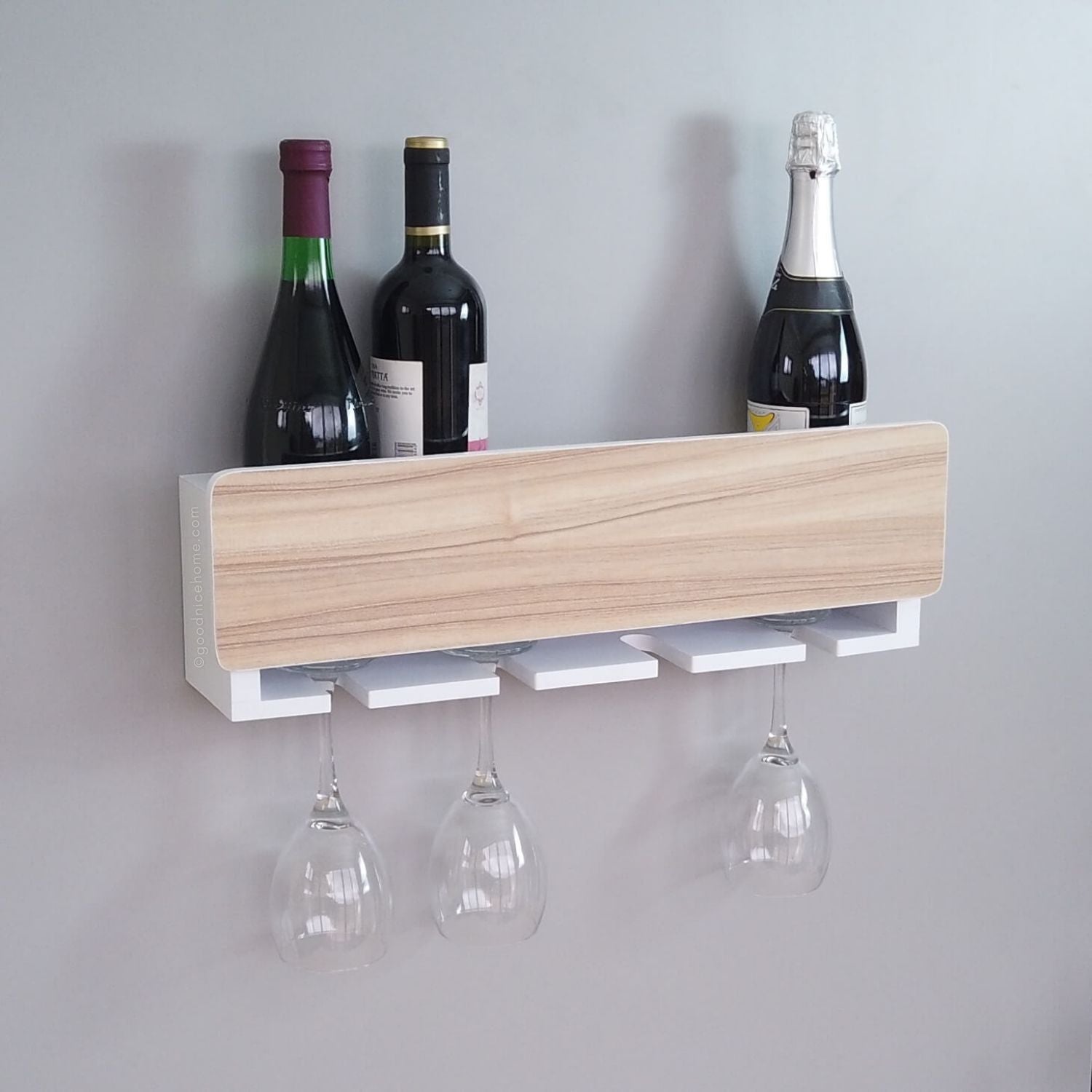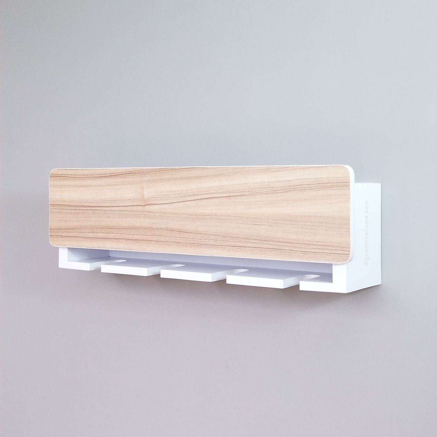 Save counter space by elevating your wine collection and stemware in our modern and minimalist wall-mounted wine rack. The two-tone neutral color with its clean aesthetic would fit a variety of interior styles. Fits 5 bottles and 4 stem glasses suspended underneath.