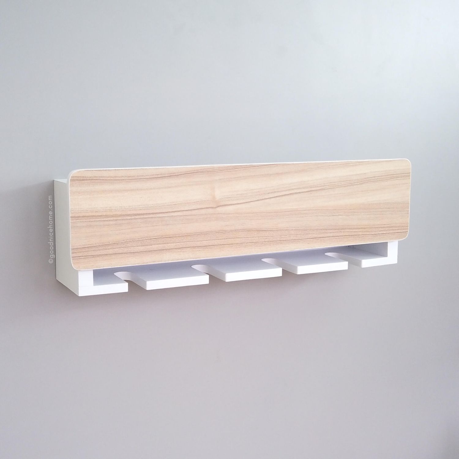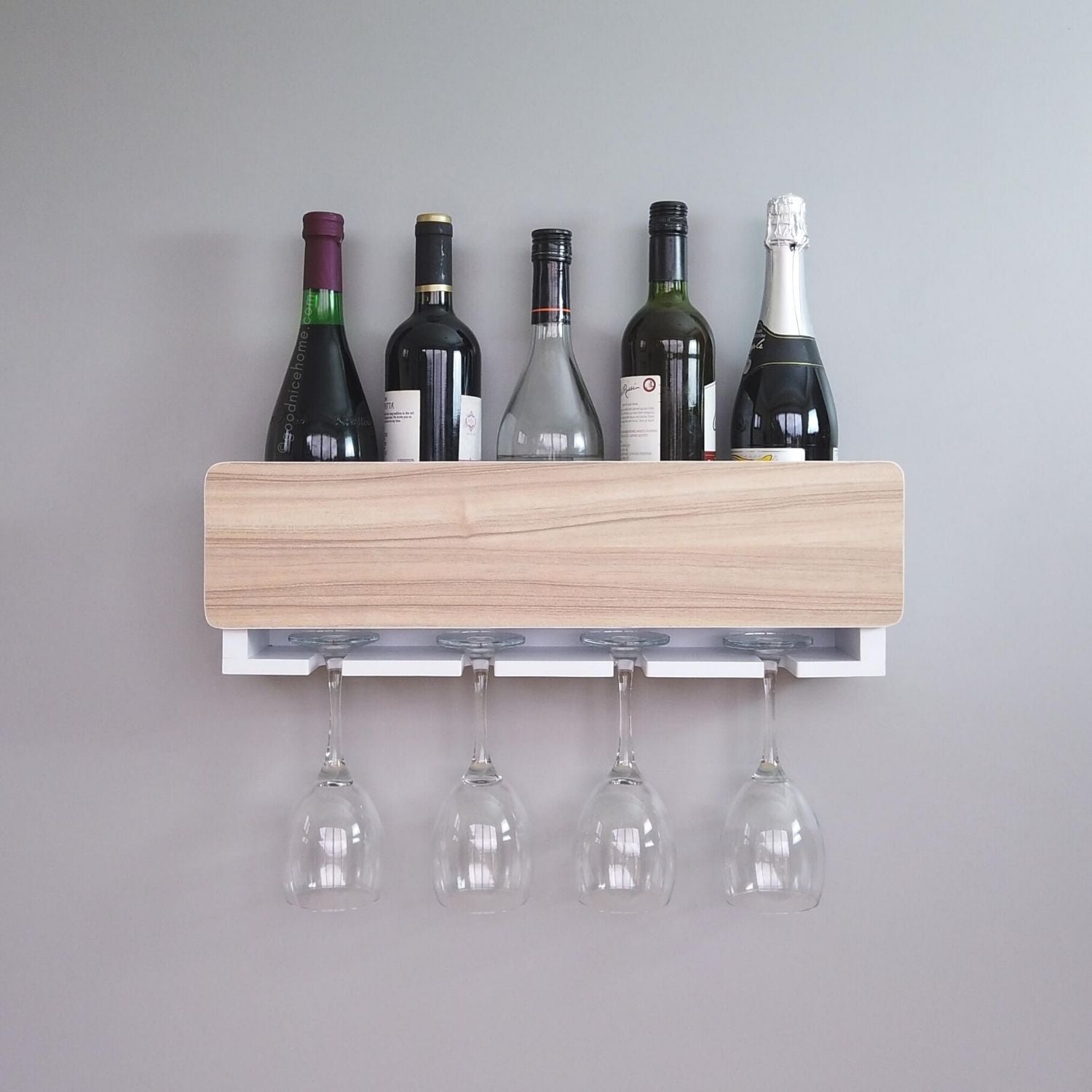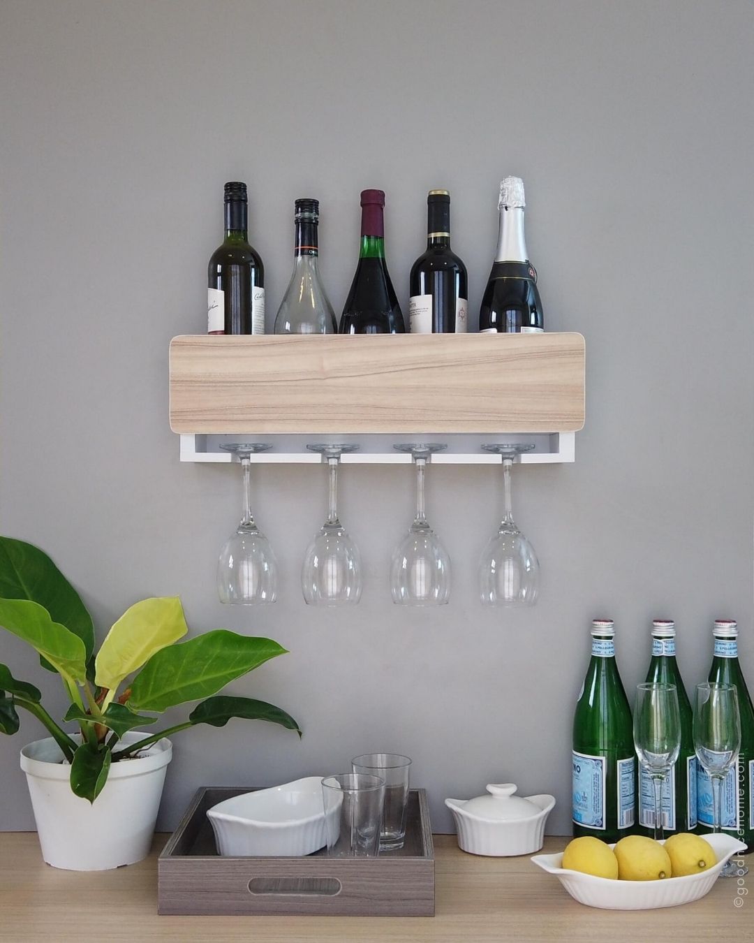 Save counter space by elevating your wine collection and stemware in our modern and minimalist wall-mounted wine rack. The two-tone neutral color with its clean aesthetic would fit a variety of interior styles. Fits 5 bottles and 4 stem glasses suspended underneath.