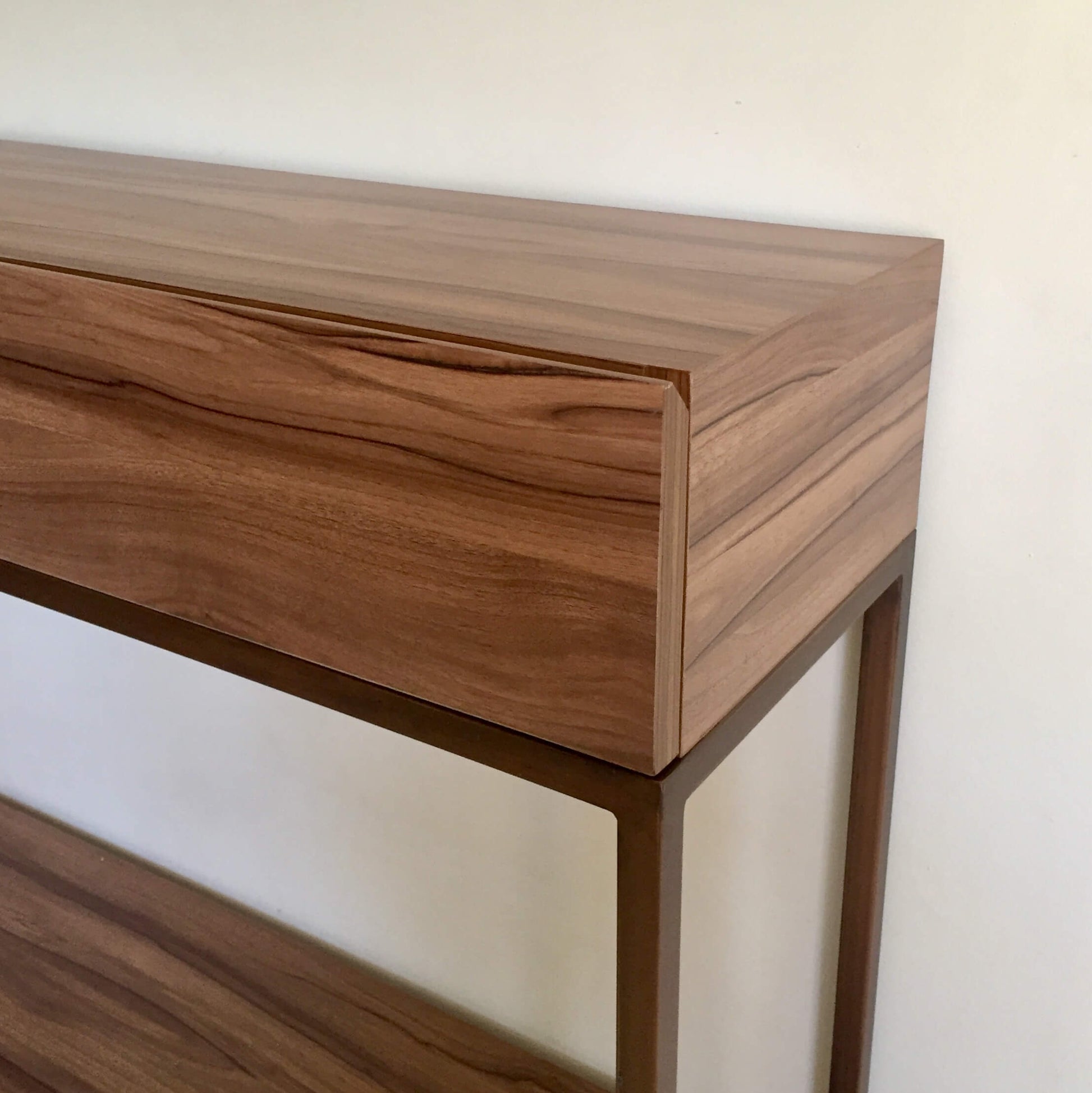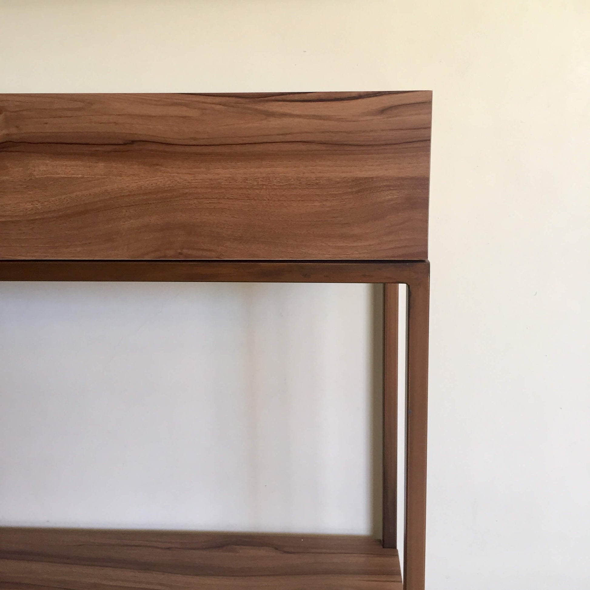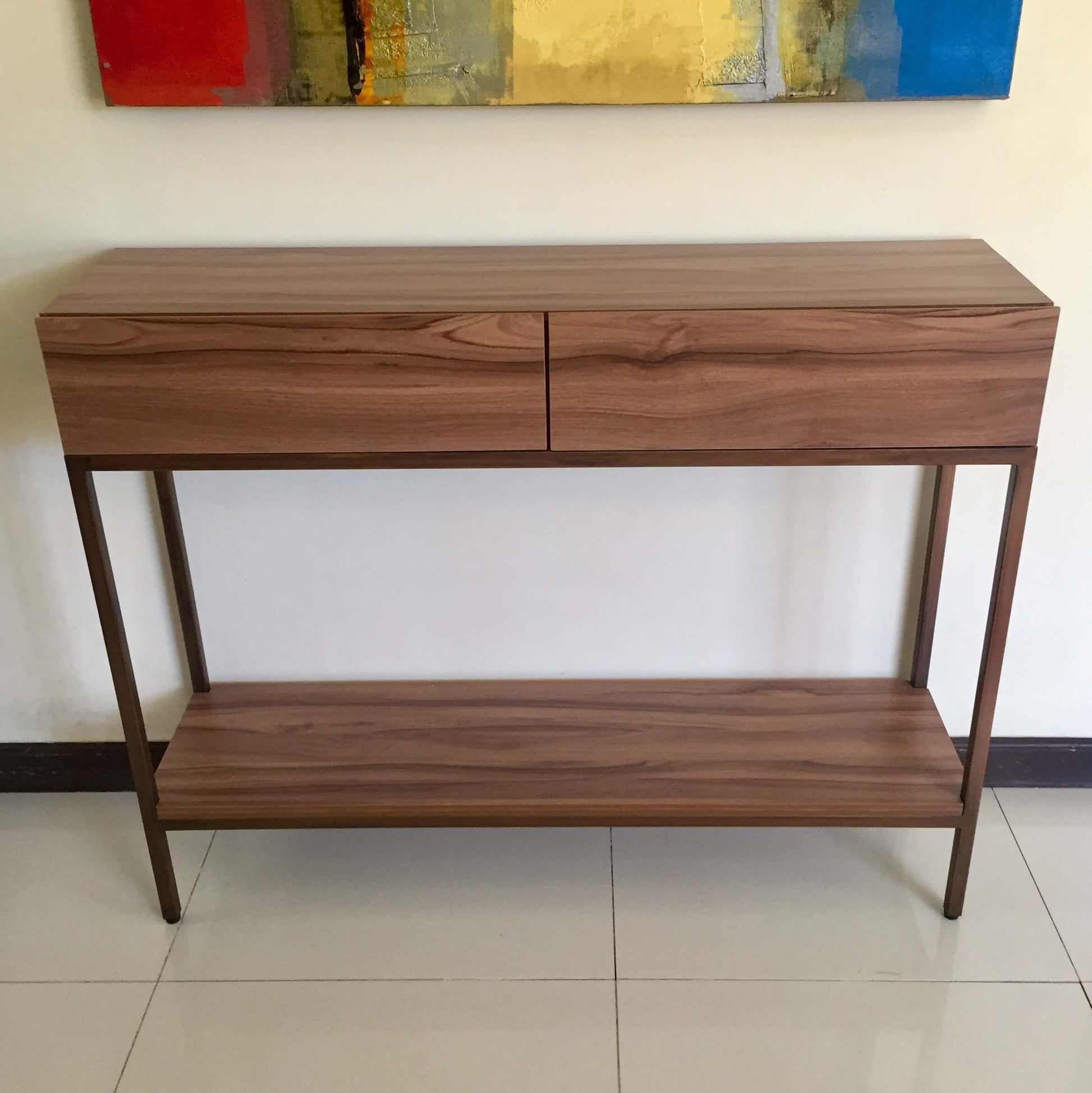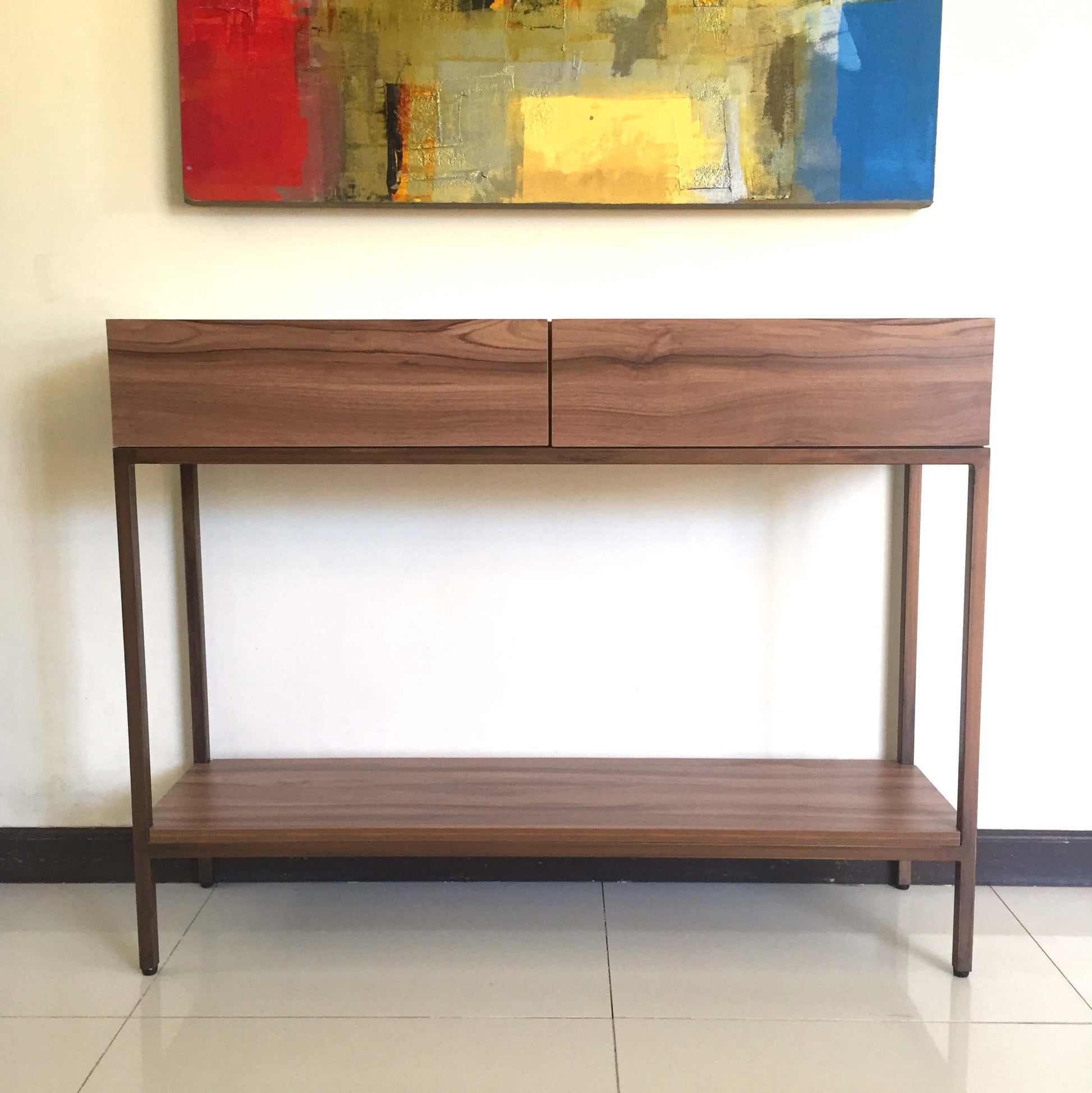 One of our "One-Off" pieces*, a version of our Modern Console Table, in a beautiful wood grain pattern, set on Antique Bronze metal legs, giving it a timeless and classic look. With two drawer cabinets & an extra shelf, giving your foyer (entryway or hallway) a stylish extra storage or to display family photos.