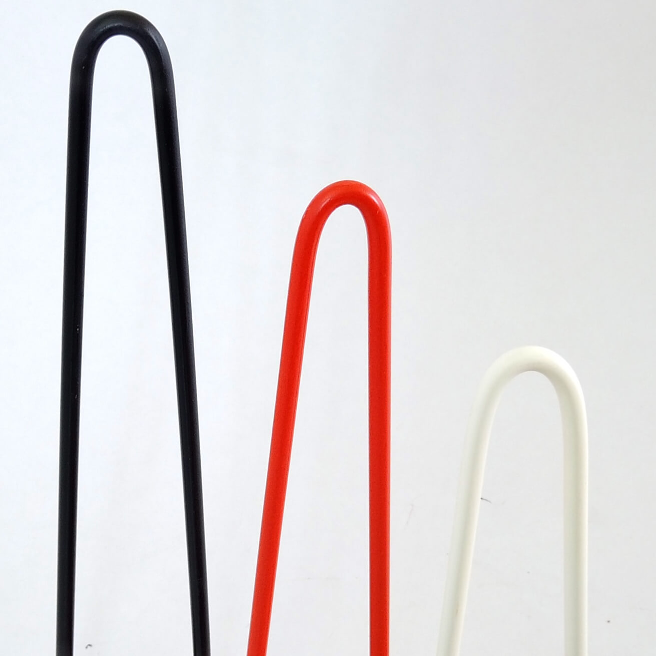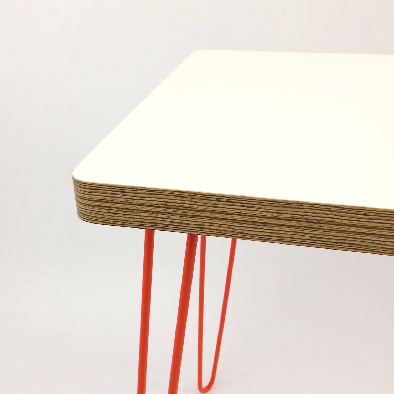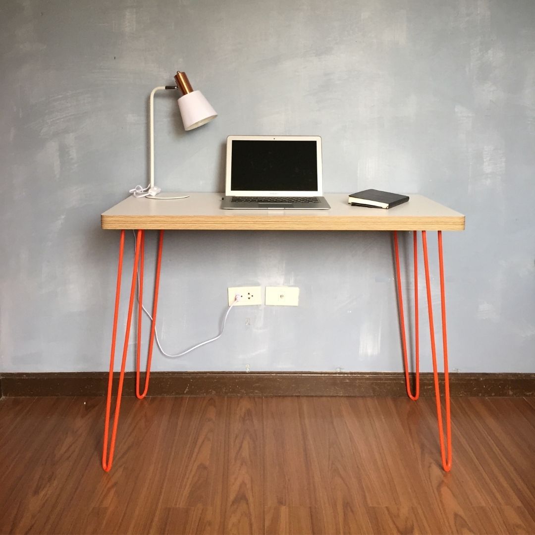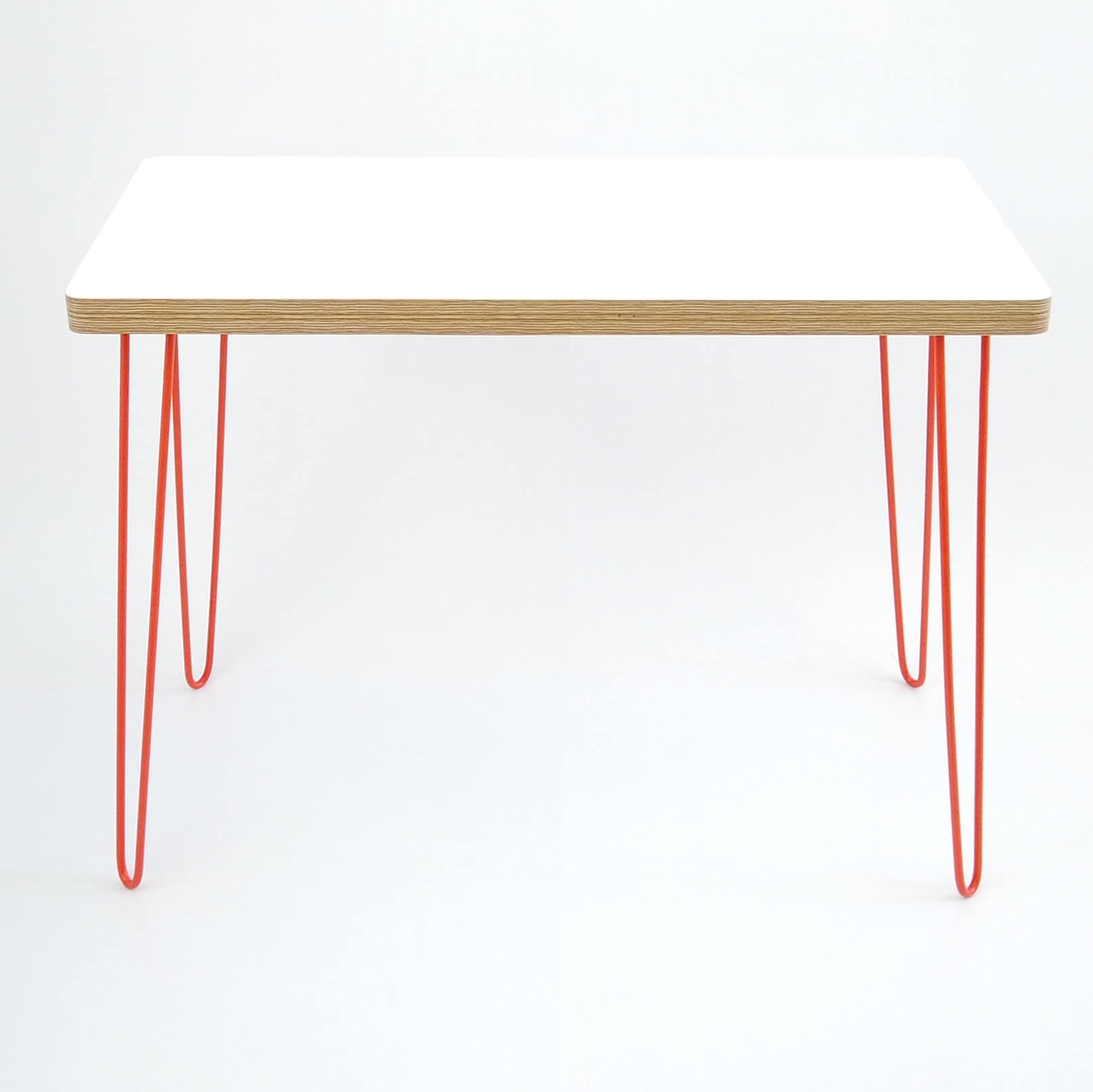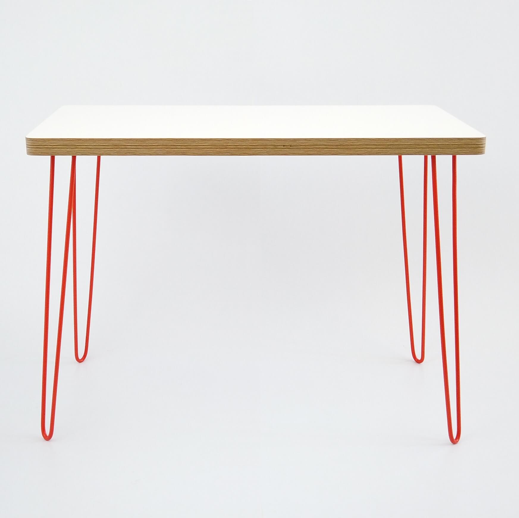 The Retro Hairpin Desk - for those working or studying from home. Our version of the retro-looking simple hair-pin desk with rounded corners giving a sleek look. With a durable & hard-wearing HPL laminated white table top, providing a wipe-clean finish, set on lacquered hair-pin metal legs. A slim design that saves space while providing an ample work/study area. Legs available in White, Black or Orange (our preference :).