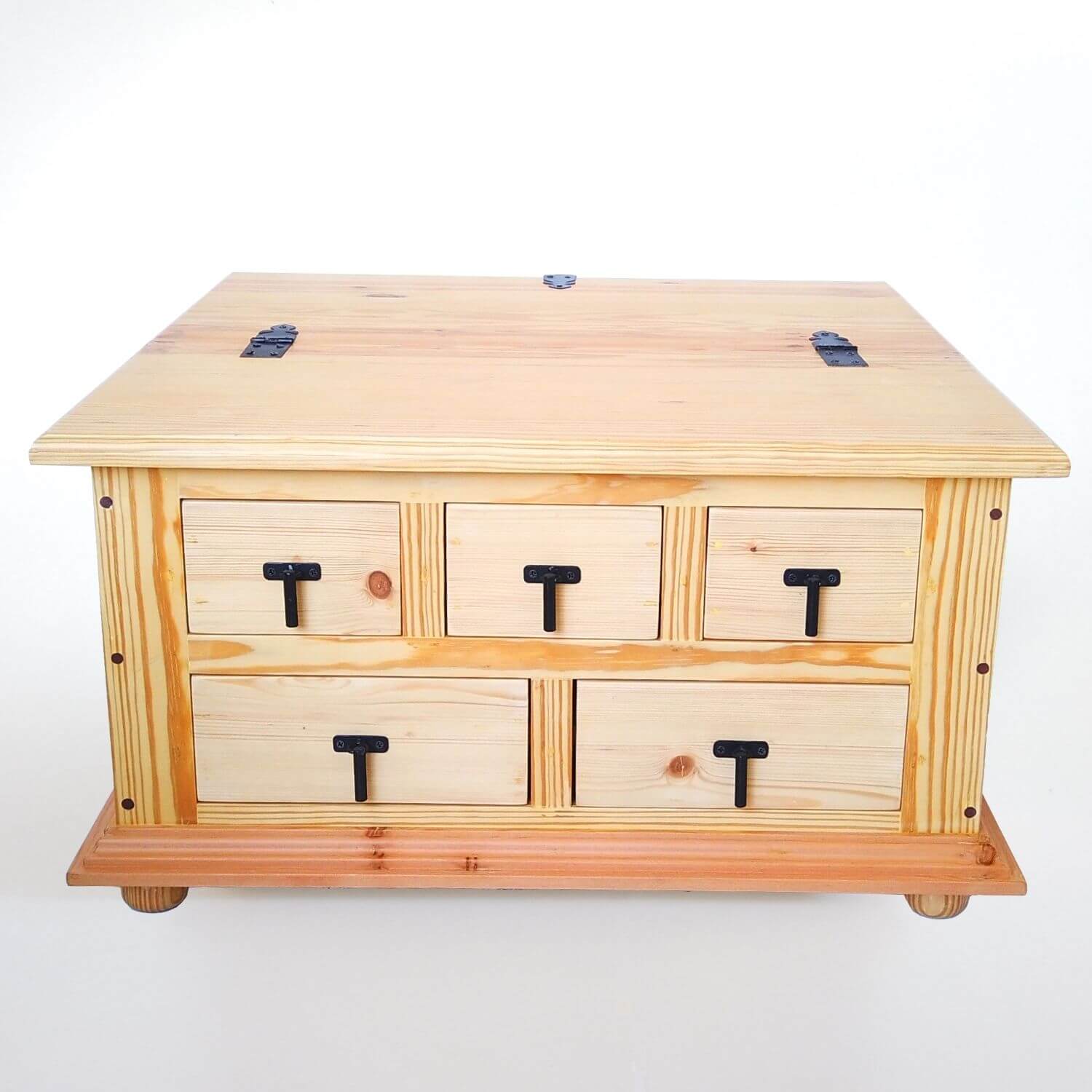 With 5 drawers on one side, and a large storage trunk section on the other side, it is the perfect storage system for your living room or your den. Like its counterpart Rustic Trunk Chest, this piece exudes an old-world charm and brings warmth and organization to any room. A smaller version is also available.