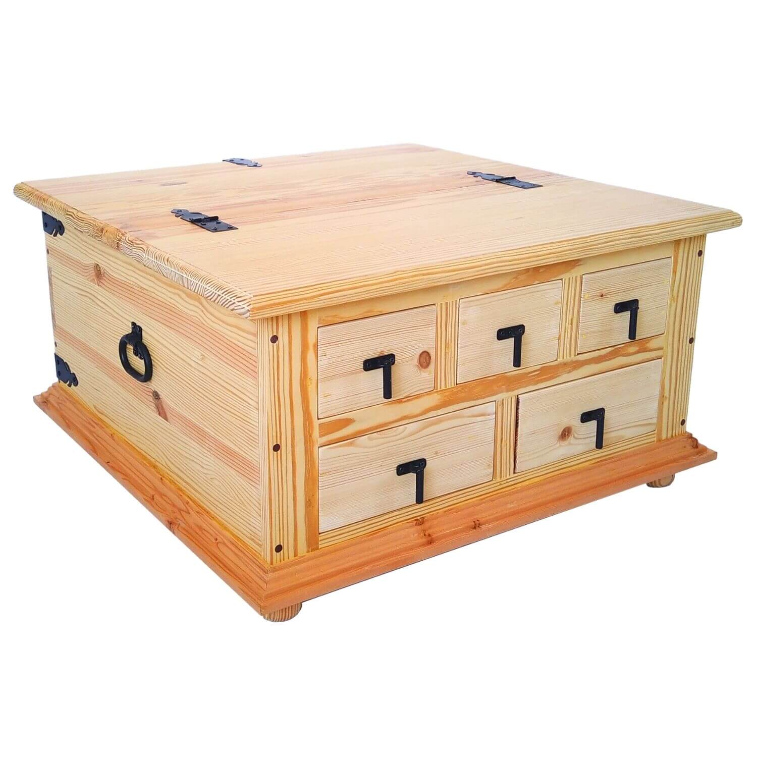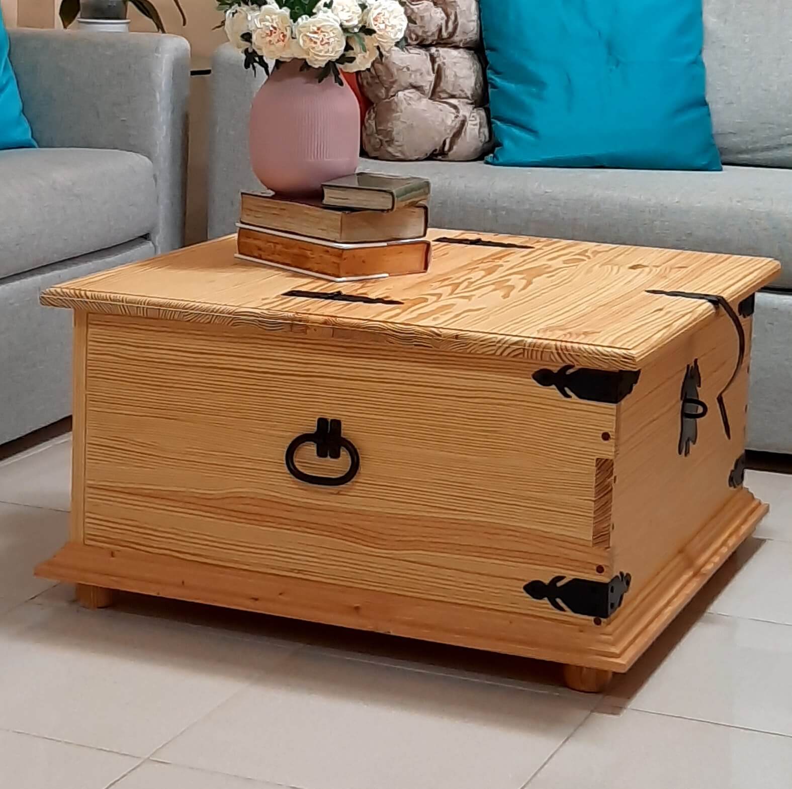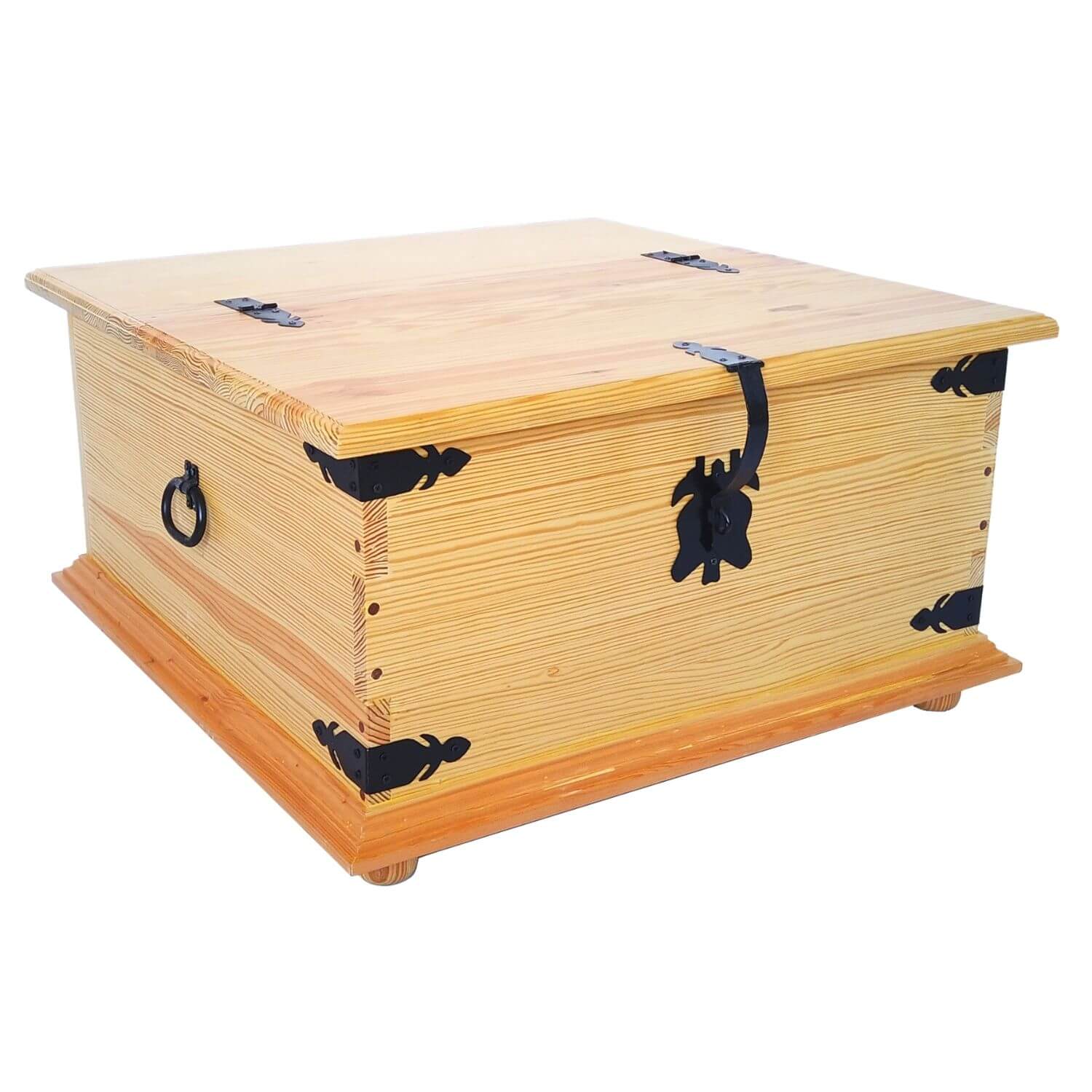 Finely handcrafted from Solid Pine Wood with metal accents, this large Square Coffee Table Storage Chest is stained in a natural finish highlighting the raw beauty of pine wood, complimented by the hand-forged metal handles, the hand-made latch, hinges and decorative corner details. Elegantly moulded top lid edges and skirting show skillful wood-working craftsmanship.