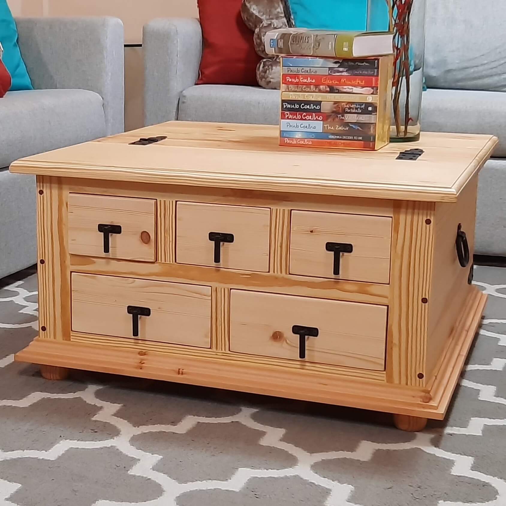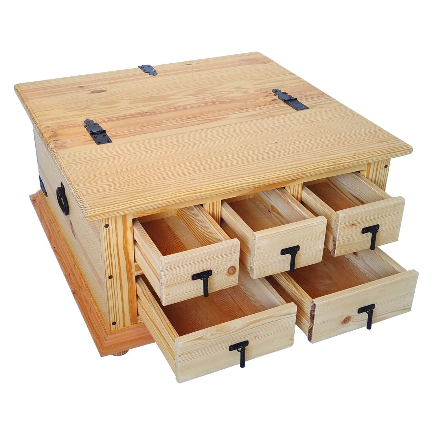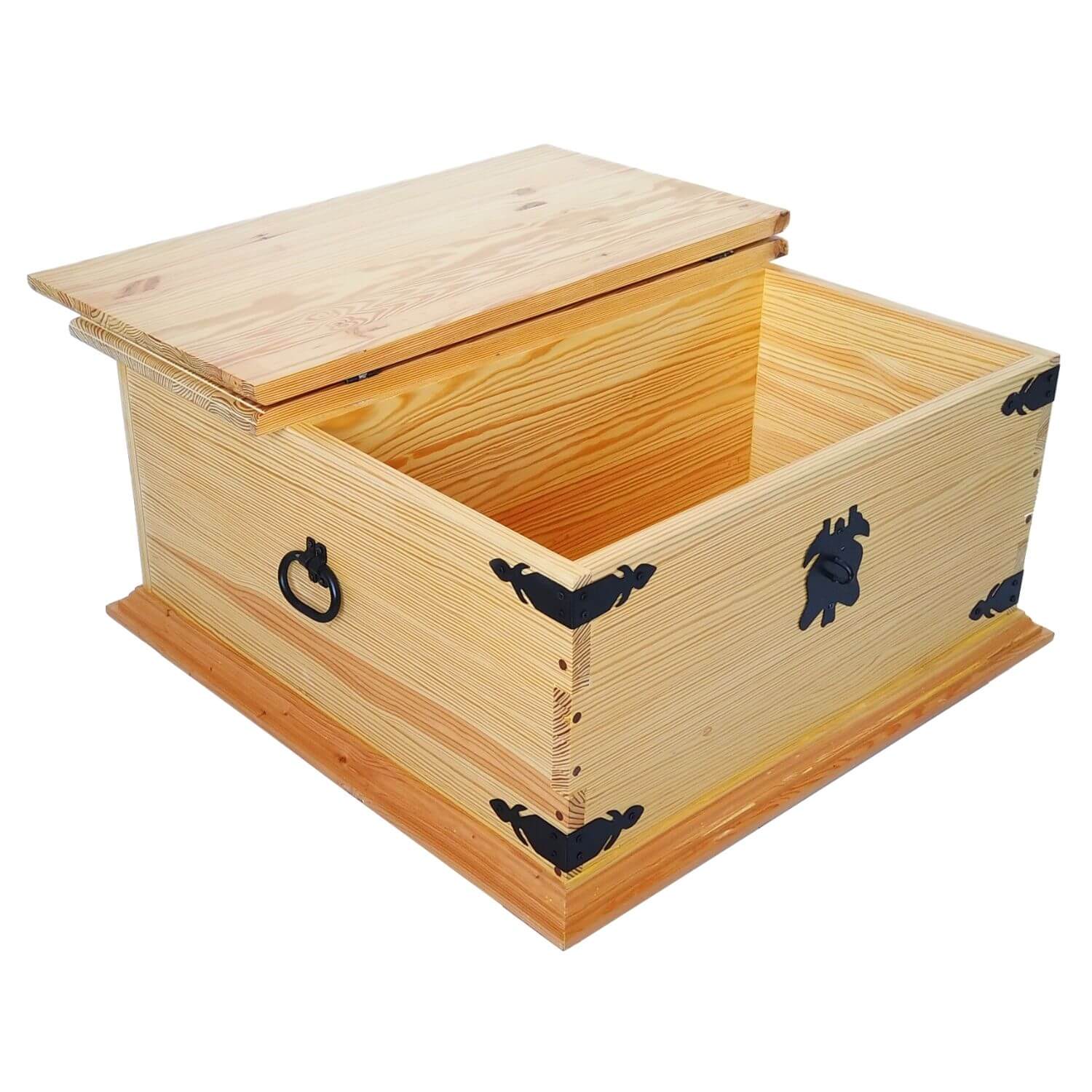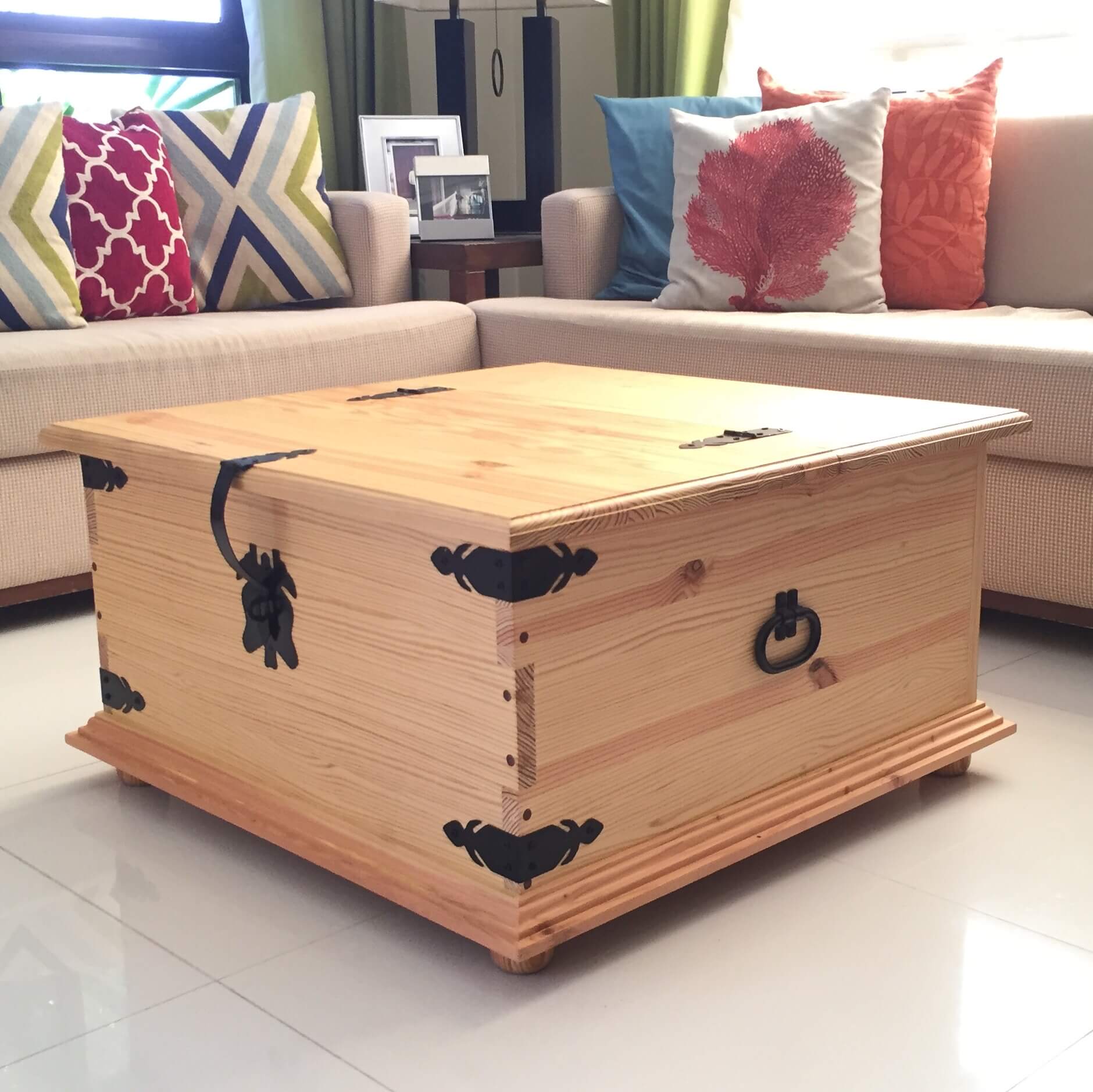 Finely handcrafted from Solid Pine Wood with metal accents, this large Square Coffee Table Storage Chest is stained in a natural finish highlighting the raw beauty of pine wood, complimented by the hand-forged metal handles, the hand-made latch, hinges and decorative corner details. Elegantly moulded top lid edges and skirting show skillful wood-working craftsmanship.